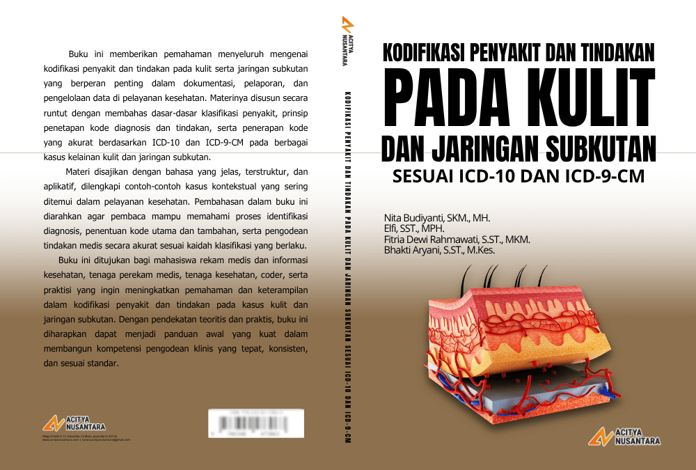 Kulit dan jaringan subkutan adalah salah satu pokok bahasan diagnosis maupun tindakan medis. Oleh karena itu, pemahaman yang komprehensif mengenai kodifikasi berdasarkan standar internasional ICD-10 dan ICD-9-CM sangatlah penting. Buku ini diharapkan dapat menjadi panduan praktis sekaligus teoritis, bagi mahasiswa untuk memperoleh bekal akademik yang kuat untuk menguasai keterampilan kodifikasi, bagi praktisi memiliki acuan yang jelas dan sistematis dalam penerapan kodifikasi di fasilitas pelayanan kesehatan serta Institusi pendidikan dan pelayanan kesehatan dapat meningkatkan mutu pencatatan serta pelaporan data kesehatan.
